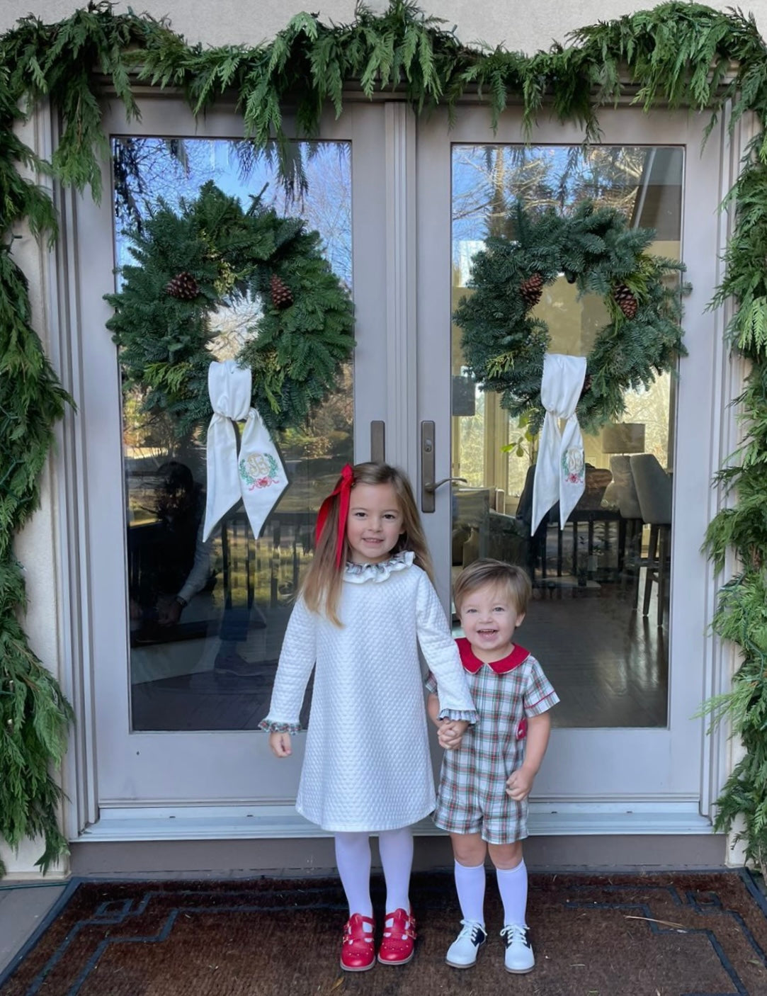 Celebrate Christmas with a beautifully decorated front porch and let us help with the doors! Our wreath sashes made a great backdrop for these precious babies!